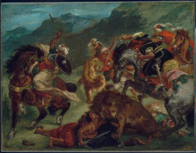 Delacroix, the French Romantic master, conveyed another kind of turmoil: the raw, physical struggle between man and nature. In The Lion Hunt (1858), chaos unfolds in a flurry of hooves, claws, and raised weapons. Hunters on horseback clash with ferocious lions, their bodies twisted in motion, their faces locked in grim determination or panic. The composition spirals with energy, filled with tension and movement. Delacroix does not offer neat heroism. Instead, he immerses the viewer in a violent ballet, where survival and savagery are inseparable.