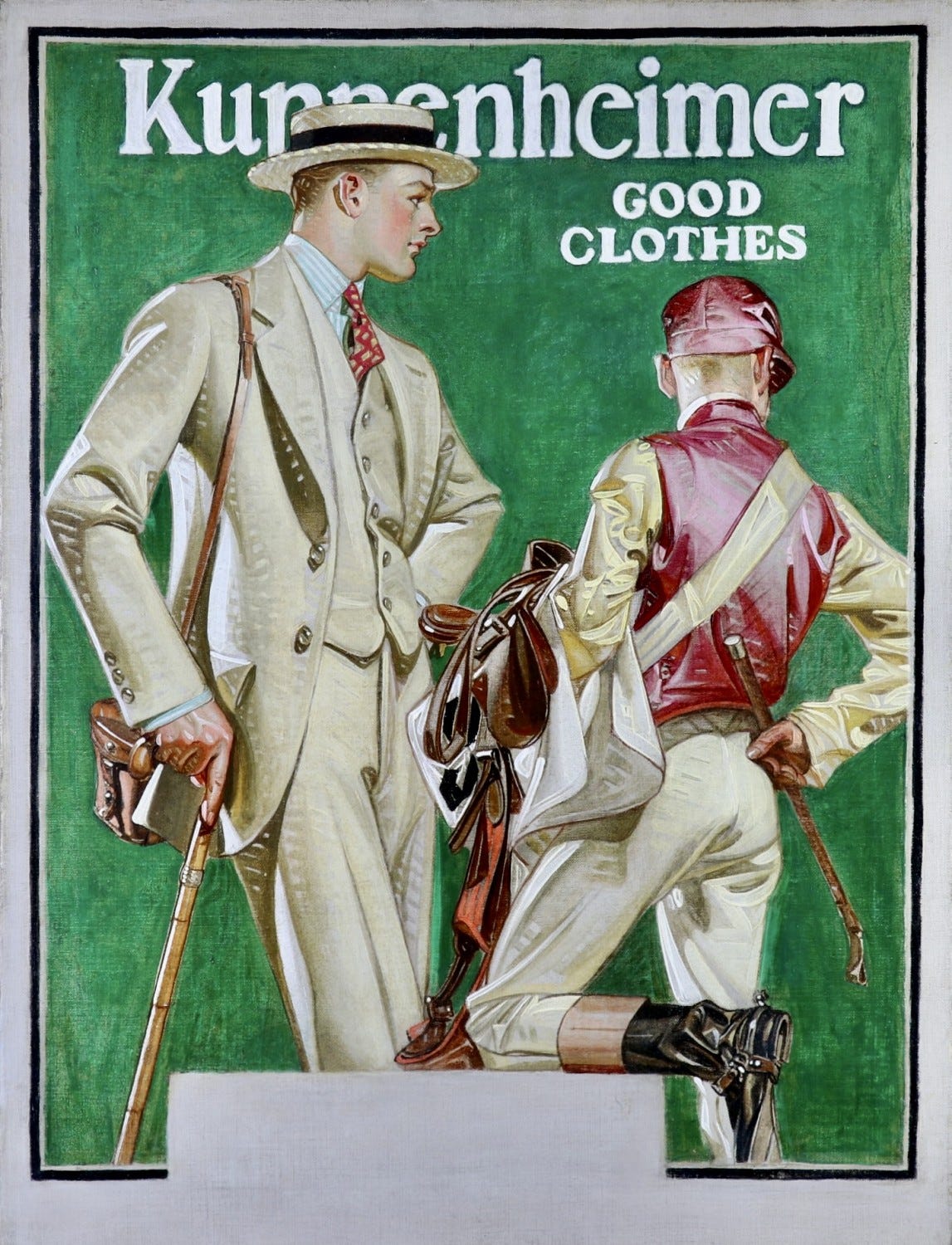 This is demonstrated in a Kuppenheimer Clothing Company advertisement published in The Saturday Evening Post on June 14, 1923, where Leyendecker builds a strong composition through the clothing alone. The illustration features a sharply dressed man with a controlled, upright posture. Light falls across most of the fabric, while shadows lift the folds and separate the layers to create depth and texture. He is paired with another figure whose clothing is looser and more heavily folded, providing a visual contrast that makes the central figure appear even more composed and refined. The result is a design that feels both luxurious and efficient, qualities that remain highly relevant to fashion and advertising illustration today.